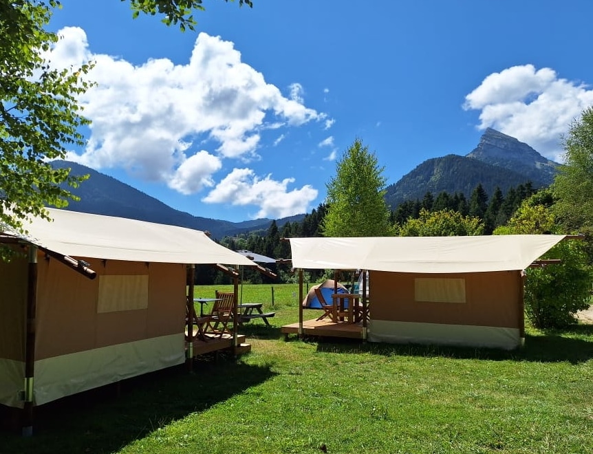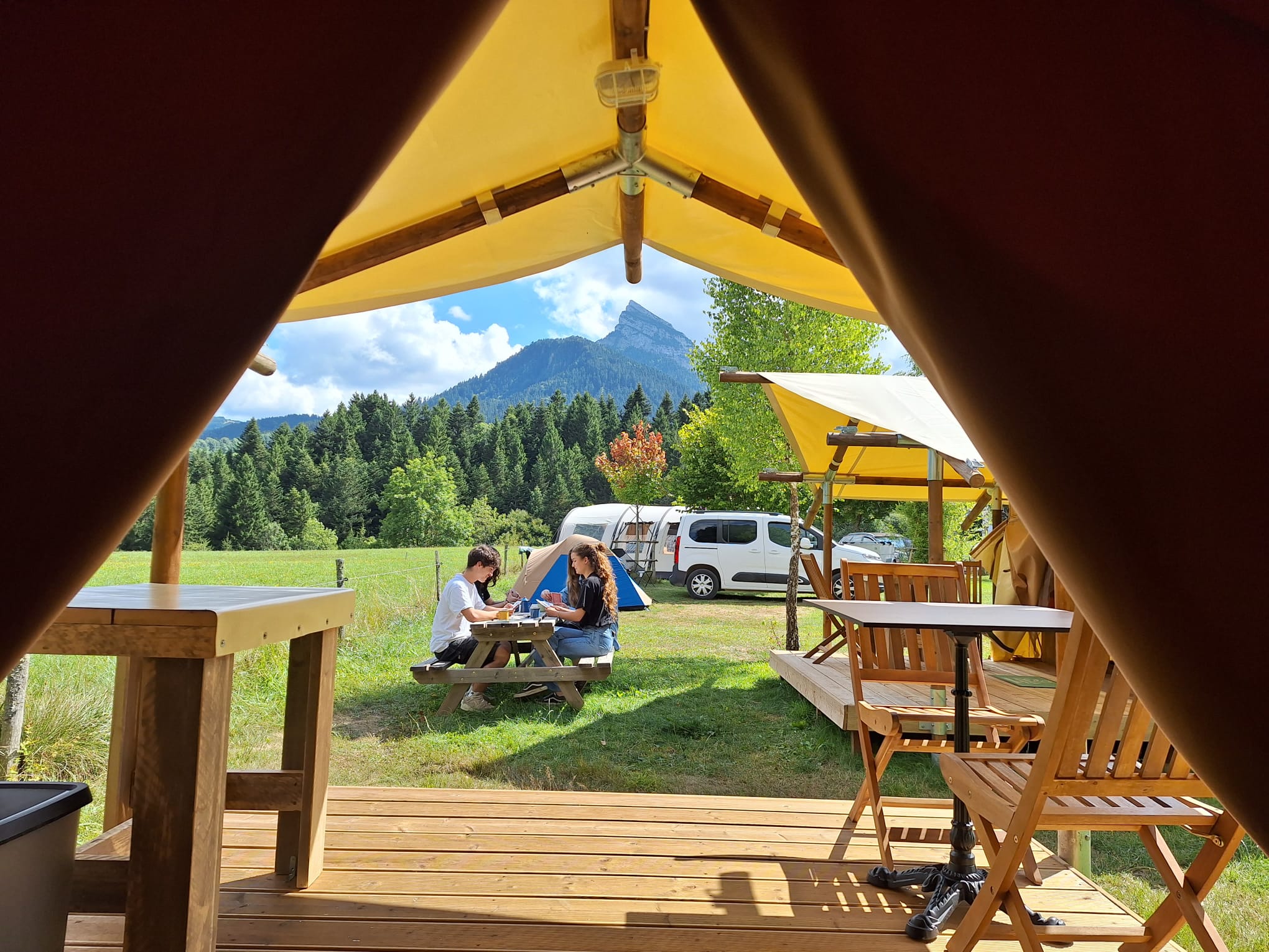 Pour des vacances en Isere, parmi nos hébergements en Chartreuse nos Tentes sont équipés de 2 terrasses avec dans la partie centrale en herbe une table de pic-nique.